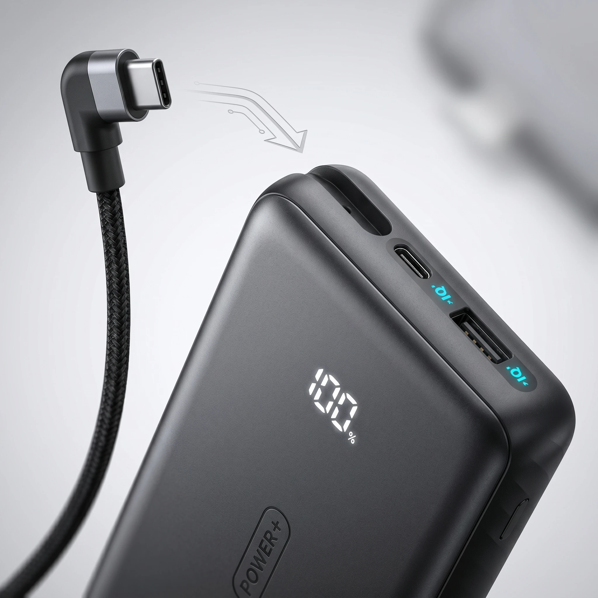 شحن أسهل بدون كابلات إضافية: استمتع بالراحة الكاملة مع الكابل المدمج فائق المتانة من نوع USB-C؛ لن تضطر للبحث عن سلك شحن بعد الآن، فهو دائماً معك وجاهز للعمل.