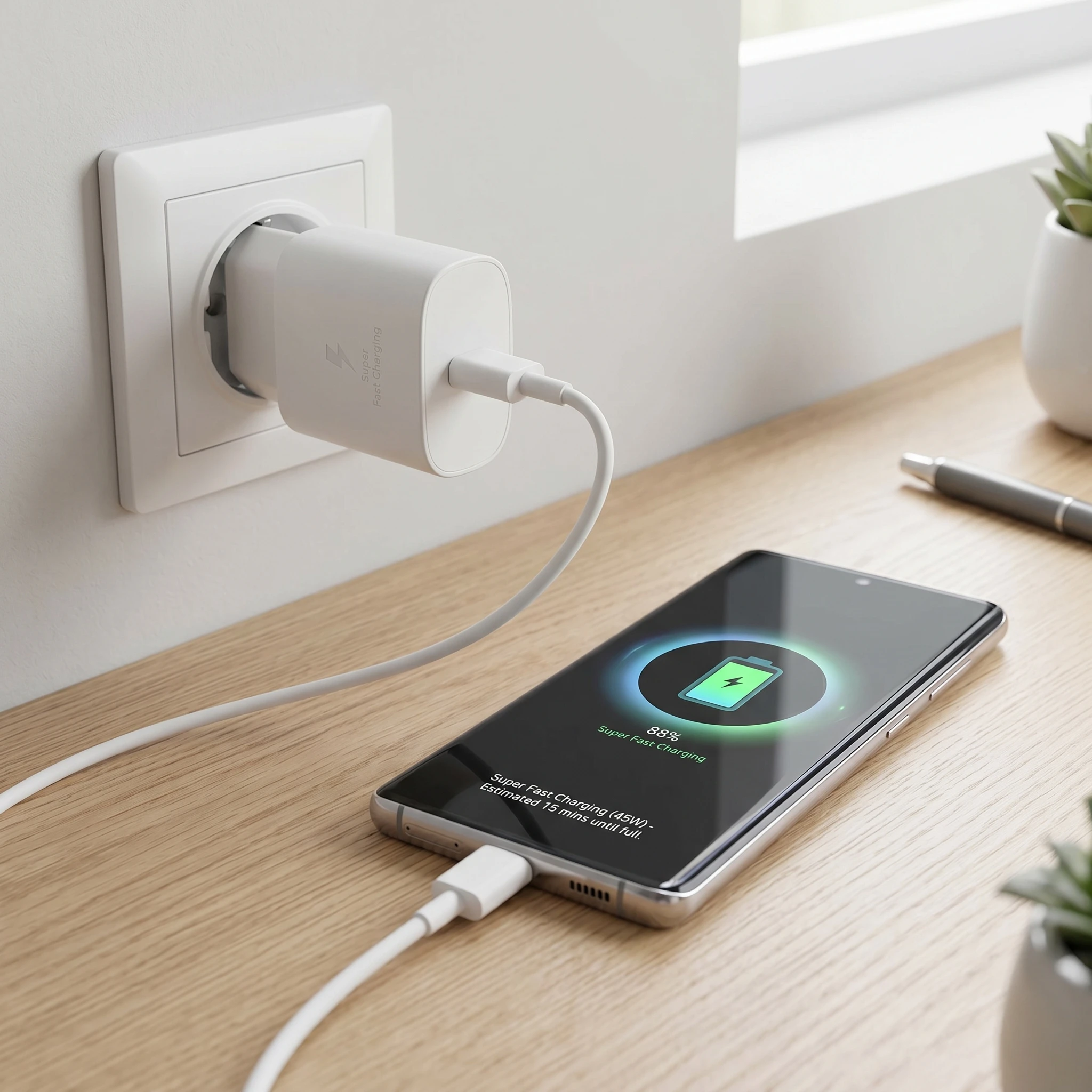 مع شاحن Samsung 25W Super Fast Charging هتقدر تشحن جهازك بسرعة وكفاءة وتخليه جاهز للاستخدام في وقت أقل بكتير.